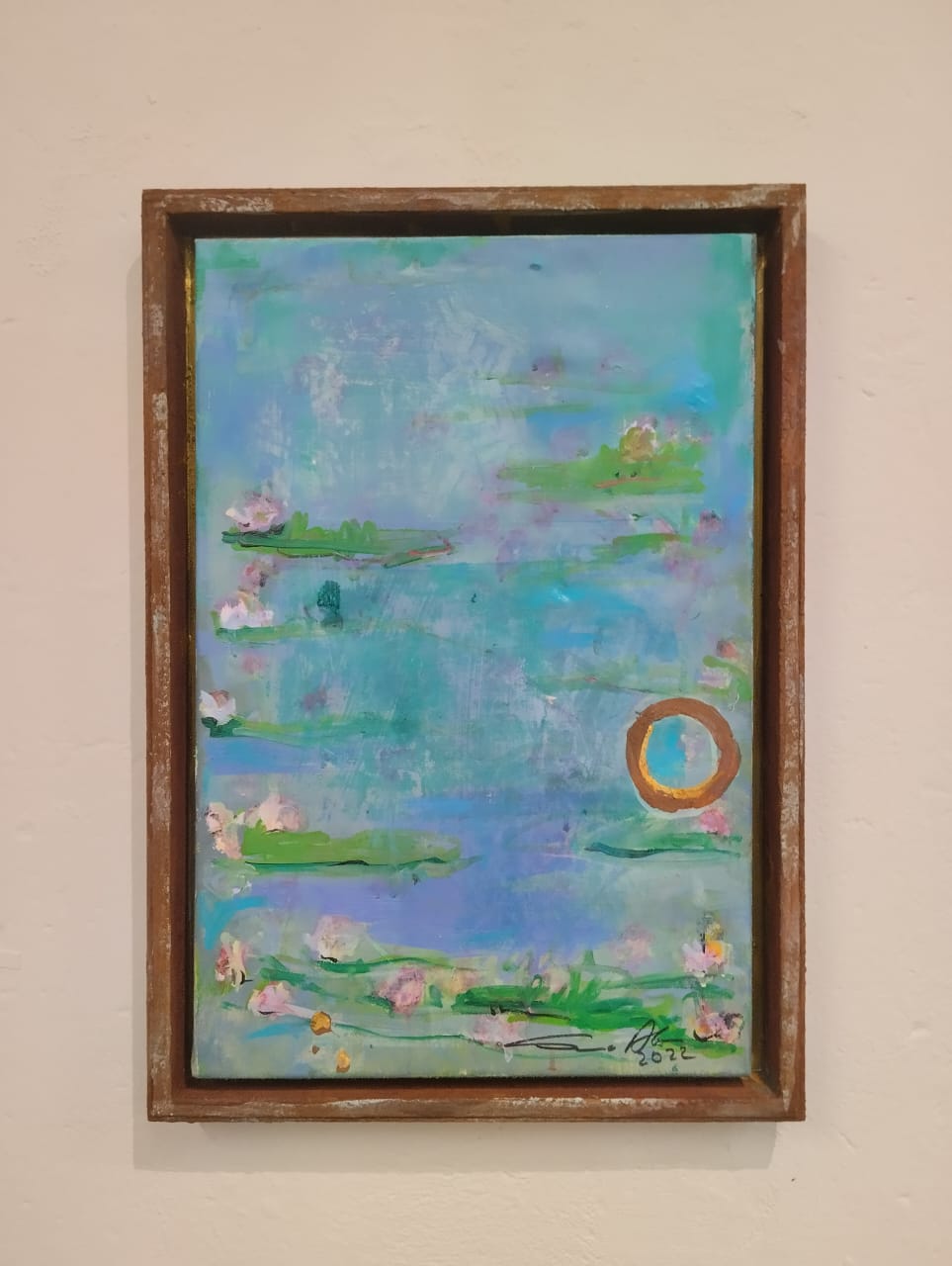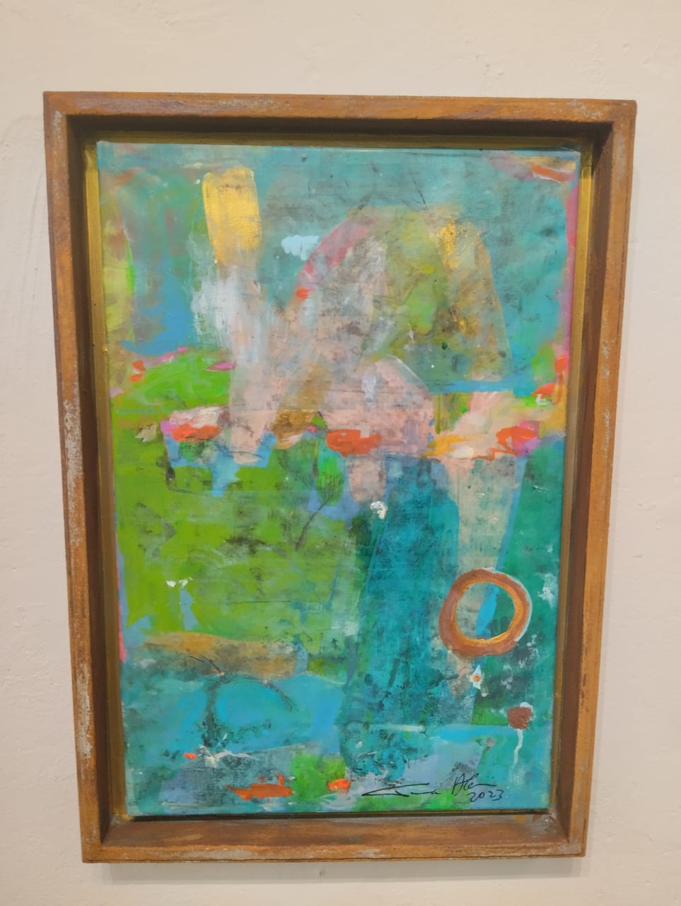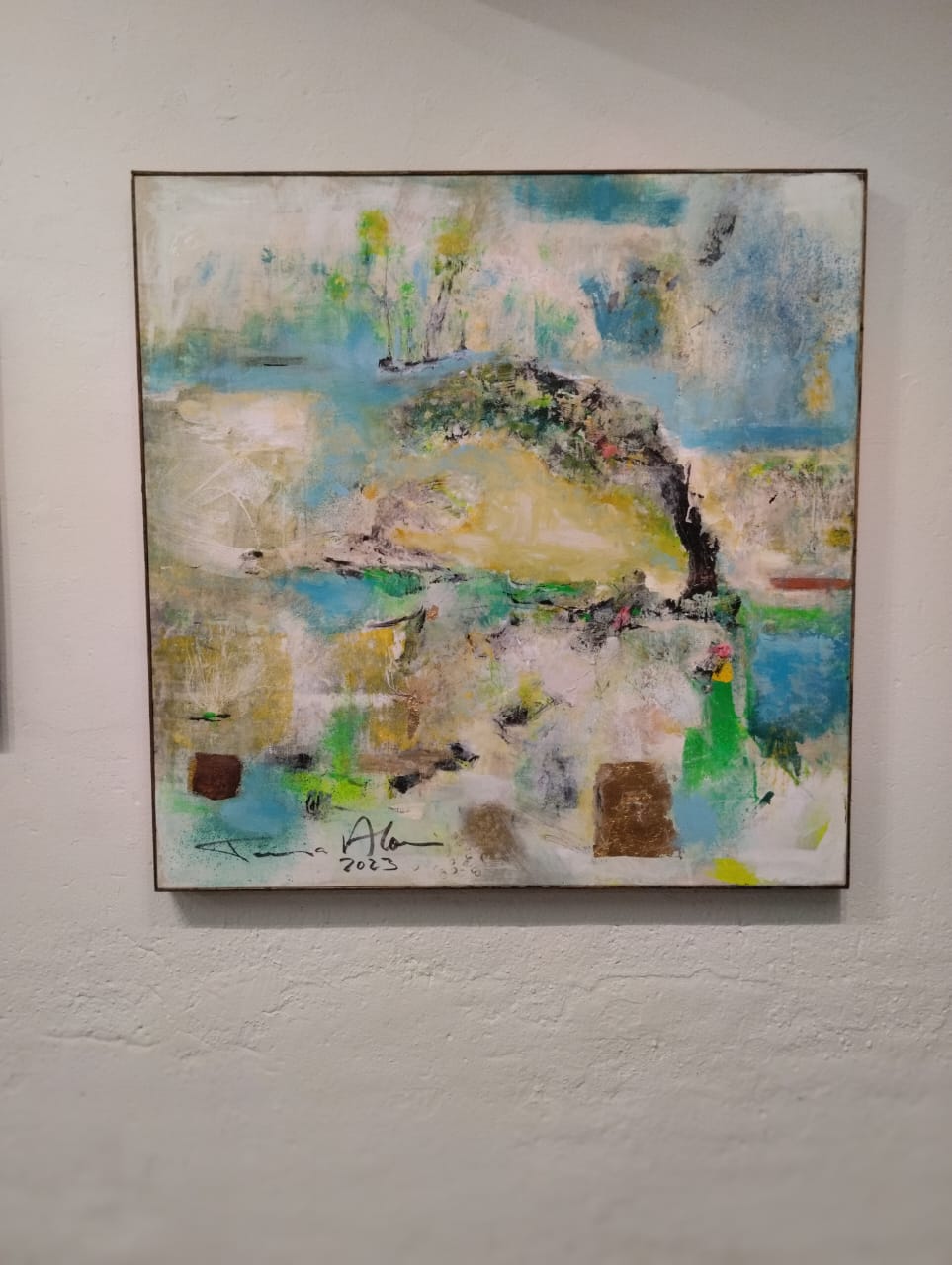 Die Arbeiten der Künstlerin mit Franko- Marokkanerin sind abstrakt, also nur Farbe und Form. Nur Farbe und Form? Die Titel ihrer Bilder sprechen eine andere Sprache. Da geht es um Bäume, Wind, Licht, Luft und Flüsse. Aus allen ihren Bildern spricht Bewegung, Überlagerung und Durchdringung von Flächen und Farben. Nichts steht still, wie schon der Philosoph Heraklit um 500 vor Christus sagte: „Alles fließt.